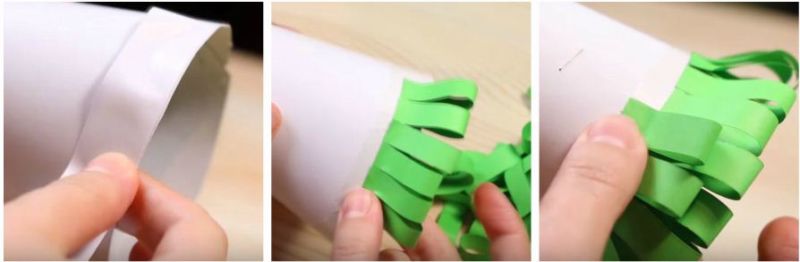 1. З білого аркуша картону скручуємо конус. Низ закріплюємо степлером, а верх – скотчем. Його низ треба ретельно підрівняти, щоб ялинка могла стояти.