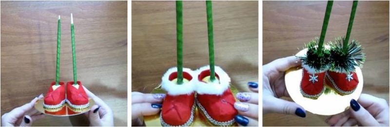 4. Приклеюємо ніжки на золотисту підставку. Верх черевичок прикрашаємо білим штучним хутром. А барила від кіндера прикриваємо зеленої мішурою. По середині черевичок приклеюємо декоративні сніжинки.