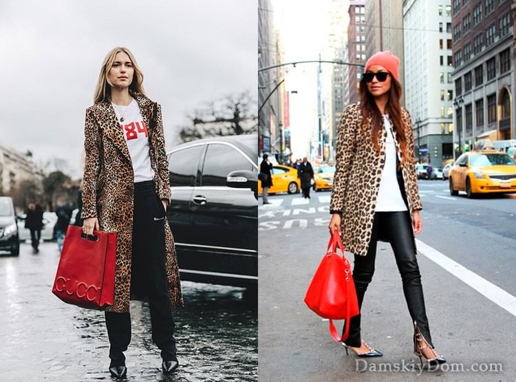 По-справжньому дикий принт, здавалося б, просто потребує «заспокійливе». Але не тут-то було – нейтралізувати агресію ми будемо з допомогою не менш самодостатнього червоного кольору. Головне – використовувати його в помірних дозах. Що може знадобитися для леопардового пальто? Червоний принт на футболці толстовці, сумка, туфлі, шовковий шарф або головний убір (особливо актуальні в новому сезоні кепі) – не більше двох речей в одному образі! У решті ж частини цибулі краще тримати темні кольори в пріоритеті: чорний, беж, коричневий, сірий і т. д.