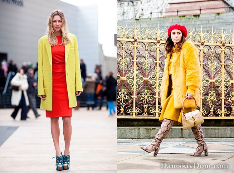 Жовтий затіває справжню колірну гру з усіма відтінками червоного! Відбираємо найсильніших гравців з сонячної команди, і це: лимонний, бурштиновий, золотистий лайм і вся гамма приглушених вохристих тонів – вони демонструють стовідсоткове попадання. Особливо якщо мова йде про поєднання одягу червоного кольору, будь то плаття або штани-палаццо, з жовтими аксесуарами і навпаки. Цибулю можна доповнити бежевим – він же може з’явитися у вигляді зміїної принта, а також синім денімом – ця річ універсальна.