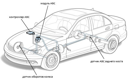 Систему АБС можна розділити на кілька функціональних блоків, щоб було простіше розбиратися в проблемі, з-за якої загоряється відповідний індикатор на панелі приладів. Зазначимо, що антиблокувальна система складається з: