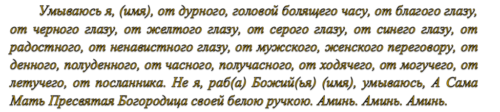 Після прочитання оббризкують голову заговоренной водою і роблять три ковтки. Залишилася воду виливають на землю.