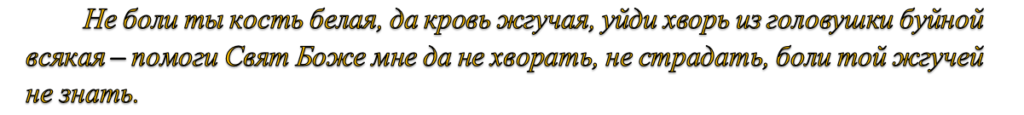 Змова позбавляє від тривалої мігрені. Беруть ніж з гострим лезом і дерев’яною ручкою і водять над головою за годинниковою стрілкою зі словами: