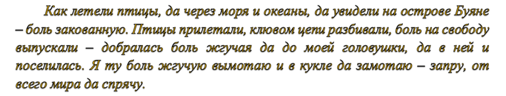 Після прочитання ляльку викидають в річку або закопують під деревом. Нічого страшного, якщо хтось знайде – біль не перейде на нього.