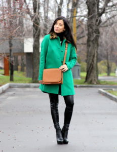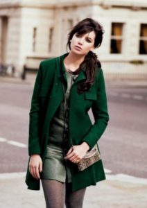 До осіннього зеленому пальто можна також підібрати розкішний палантин – елегантні вироби з кашеміру в мить ока перетворять будь-який, самий скромний спосіб. Палантини можуть бути однотонними, прикрашеними вигадливим візерунком або малюнком – найчастіше їх носять як хомут або зав’язують на манер краватки.