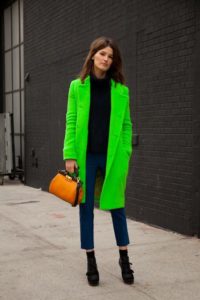 Яскраво-салатовий відтінок досить зухвалий, місцями навіть отруйний – однозначно він підійде не всім. Приталене неоново-зелене пальто до лиця молоденьких дівчат, а ось дорослим жінкам варто утриматися від подібних експериментів.