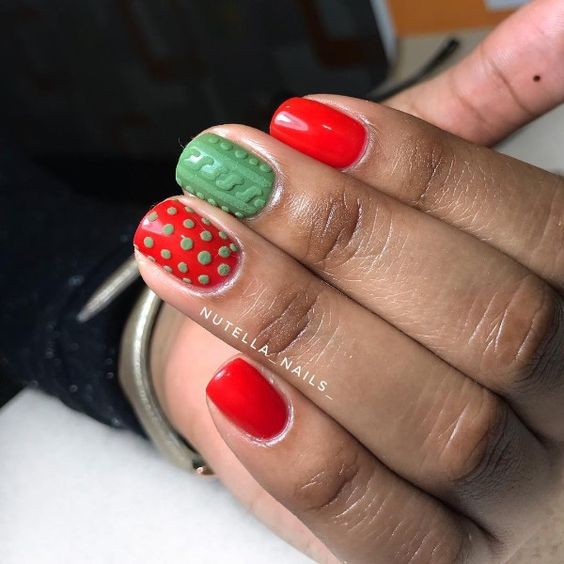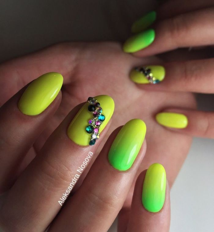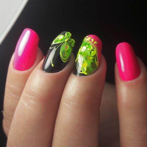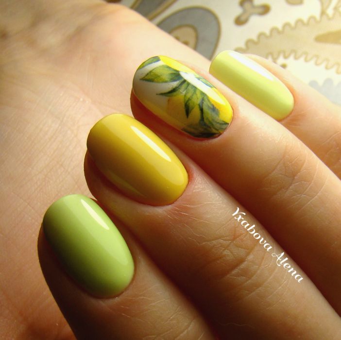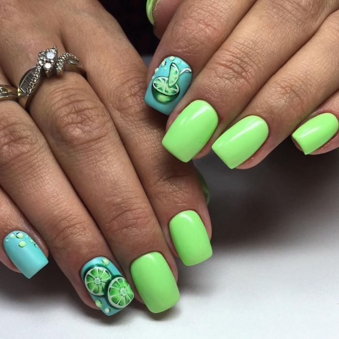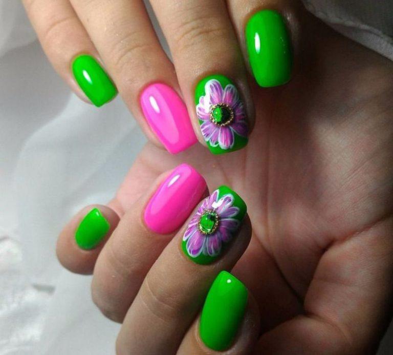 Також варто відзначити, що в літньому сезоні особливо актуальним буде поєднання зеленого кольору з жовтим. Такий дизайн дуже яскравий, сміливий і безумовно буде піднімати вам настрій навіть в похмурі дні. Не менш привабливо зелений колір виглядає з рожевим. Але в цьому випадку дуже важливо, щоб вони були одного рівня насиченості. У багатьох зелений колір асоціюється з новорічними святами. Тому в зимовий час року можна сміливо створювати тематичні малюнки, використовуючи цей колір у якості бази.