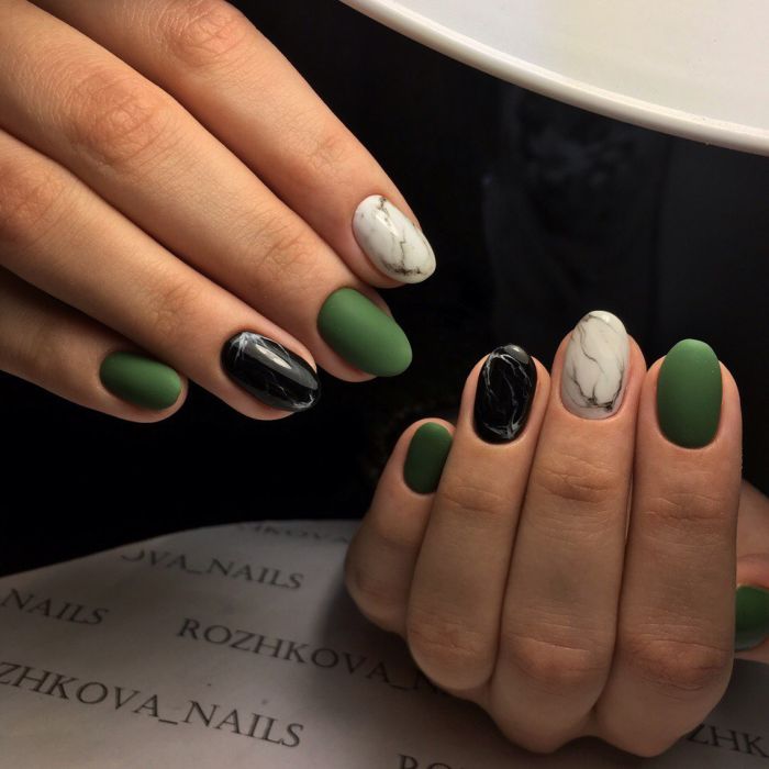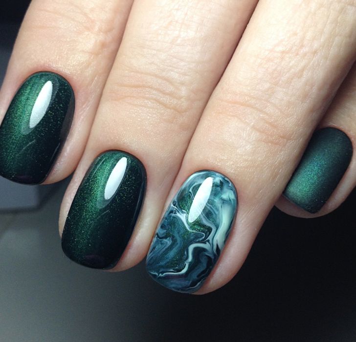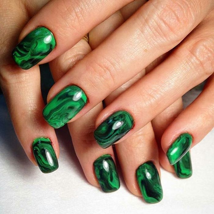 Не втрачає свою актуальність і мармуровий дизайн. Багато хто звик до того, що найчастіше він виконаний у сірому, синьому або рожевому відтінку. Безумовно, вони виглядають дуже красиво. Але не менш привабливими можуть бути і більш сміливі варіанти. Наприклад, зелений мармуровий дизайн – прекрасне рішення для вечірнього виходу або ж урочистого заходу. Втім, якщо використовувати світлі або приглушені відтінки, то такий манікюр підійде і для повсякденного життя.