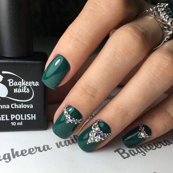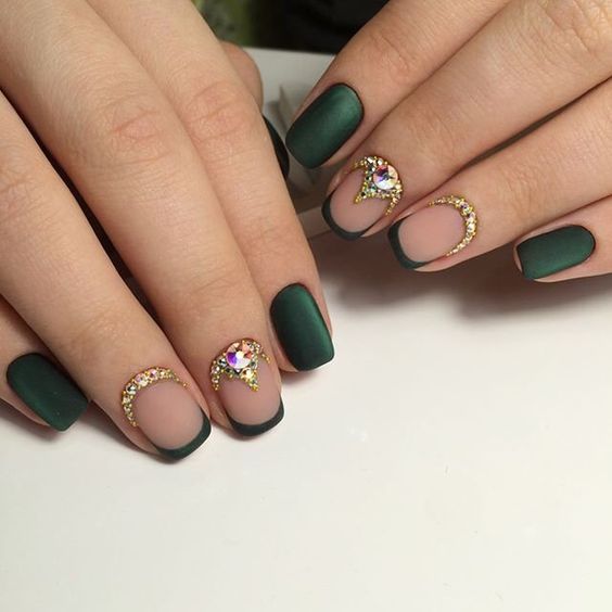 Що стосується місячного манікюру, то він відмінно виглядає в різних відтінках, в тому числі і в зеленому. До того ж, цей колір можна використовувати для заповнення лунки або ж в якості бази. Все залежить від ваших уподобань. При бажанні можна доповнити дизайн декором у вигляді страз, намистин або ж легкого малюнка. Кожен з варіантів виглядає добре.