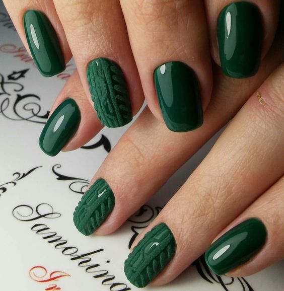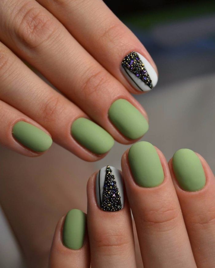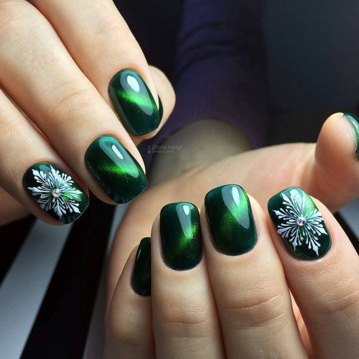 Як вже говорилося вище, зелений колір у багатьох асоціюється з новорічними святами. Тому він відмінно підходить для створення стильного, тематичного дизайну нігтів. Приміром, білі сніжинки на зеленому тлі, подарунки, ялинки, плетений дизайн і багато іншого. Все це буде доречним напередодні Нового року.