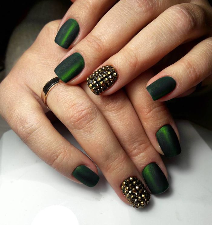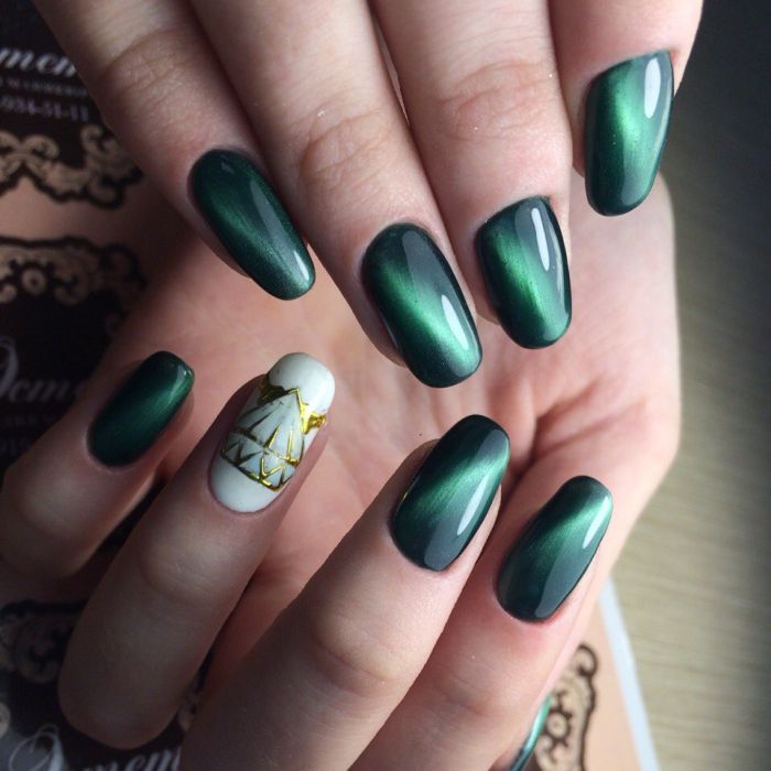 Вишуканий, розкішний манікюр котяче око – прекрасний варіант для вечірнього виходу. Такий дизайн приголомшливо виглядає саме в зеленому кольорі. Причому зовсім не важливо, яку саме фактуру ви виберете: глянсову або матову.