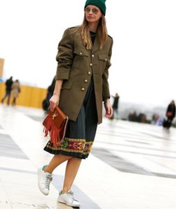 Пальто жіноче мілітарі чудово поєднується з речами абсолютно різних стилів. Наприклад, в комбінації з сукнею або спідницею-міді воно допоможе підкреслити жіночність, витонченість і витонченість.
