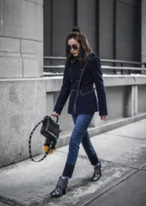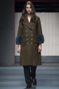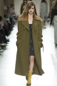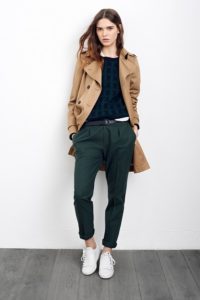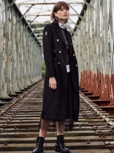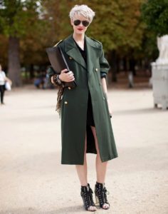 Стильно виглядає комбінація приталених моделей жіночого пальто мілітарі з джинсами, грубими шкіряними черевиками або ботильйони: