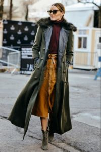 Довге темно-зелене жіноче пальто в стилі мілітарі в поєднанні з вельветовій спідницею гірчичного кольору.