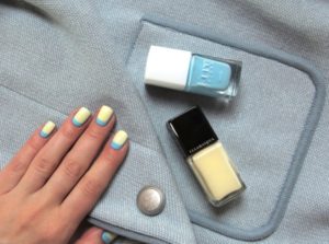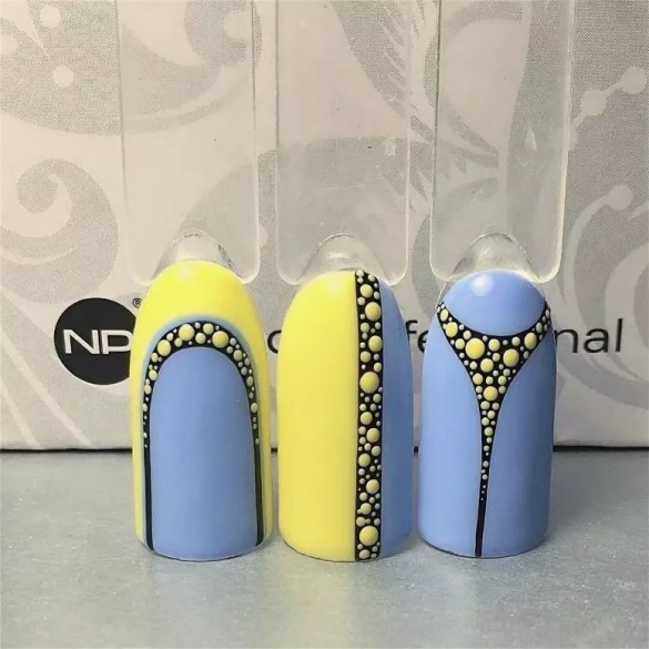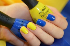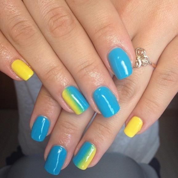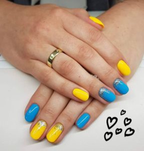 Непоганим варіантом буде додавання двох інших забарвлень. Так жовто-блакитні нігтьові пластини набувають веселий мотив і грають кольору.