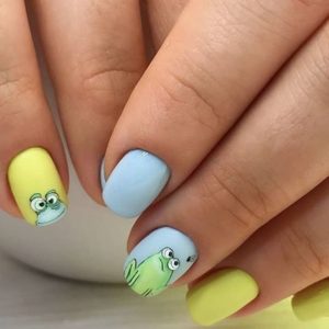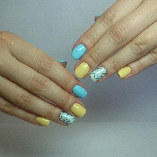 Такий дизайн підходить для будь-якої довжини нігтів. Жовто-блакитне поєднання відмінно виглядає як на довгих, так і коротких. Але таке рішення на коротких нігтьових пластинах оптимально для повсякденності.