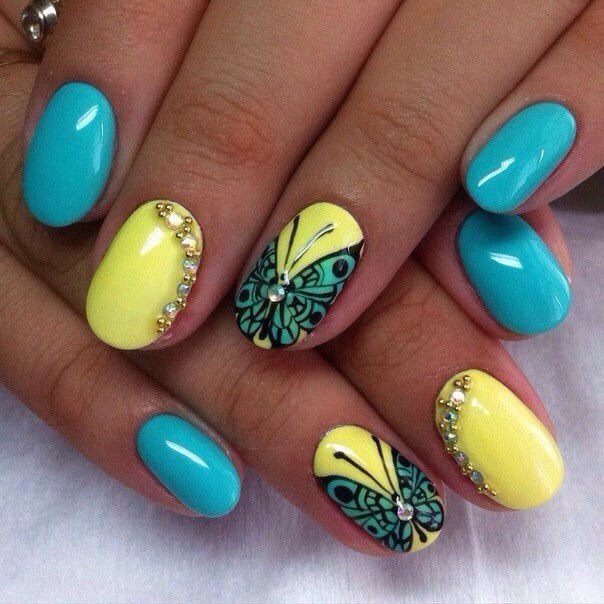 Жовто-блакитний манікюр зі стразами: покроковий майстер-клас