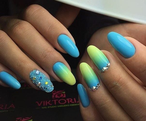 Омбре ніколи не вийде з моди. А коли змішуються блакитний і жовтий – виходить зелений, що викликається гарний настрій у власниці манікюру і в оточуючих. Прикраси завершать образ і додадуть аристократизм.
