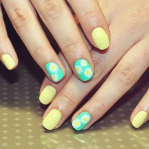 Основа в цьому манікюрі – жовтий колір. А блакитний квітка – акуратне додаток. Трохи часу і прояв фантазія – і цікавий манікюр готовий.