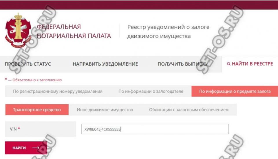 Четвертий сайт — це Федеральна Нотаріальна Палата. Адреса: reestr-zalogov.ru. Це кращий спосіб пробити авто за Провину на предмет того — кредитний він чи ні. Тут зібрана і постійно поповнюється величезна база даних про ТЗ, які виступають в якості забезпечення за банківськими кредитами.
