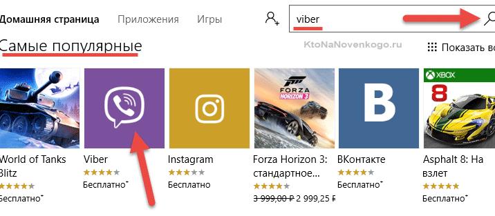 У мене як раз встановлена Windows 10 і на неї Вайбер можна скачати і поставити прямо з меню кнопки «Пуск», клікнувши по віджету «Магазин» на панелі (подобається мені «десятка» цим, та й взагалі, по-моєму, непогана «вісь», хоч і поки сирувата):