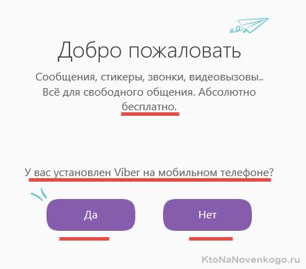 Отже, для встановлення робити нічого не потрібно, месенджер встановиться сам. Проте, після закінчення завантаження, при першому запуску програми відкриється вікно, в якому потрібно буде вказати, чи є у вас вайбер на мобільному телефоні.