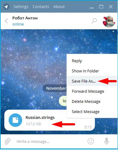 Зараз треба написати повідомлення цьому Роботові Антону, для цього натисніть на нього і відправте йому таке повідомлення: locate tdesktop. У відповідь вам прийде файл, який потрібно завантажити на комп’ютер, просто натиснувши на нього правою кнопкою миші і в контекстному меню виберіть «Save File As…», після чого виберіть місце збереження на комп’ютері Russian.strings.
