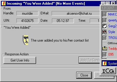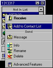 - Not In List — ICQ-користувачі, які надіслали вам повідомлення, але відсутні в Контактному листі; Якщо ви не додасте їх в список, то вони будуть видалені, коли ви вийдете з ICQ. Щоб цього не сталося, клацніть на Not In List — імені та виберіть з меню Add to Contact List.
