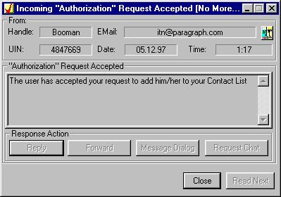 Щоб запросити ICQ-сервер автоматично додати вас в список певного користувача, позначте Automaticly, посилаючи ICQ-програму одному. Коли він зареєструється, ви будете додані до його контактного листа (якщо він, звичайно, дозволить!). А ваш друг отримає автоматичне повідомлення, коли ви ввійдете в онлайн. Тепер тисніть Execute, все інше зробить ICQ.