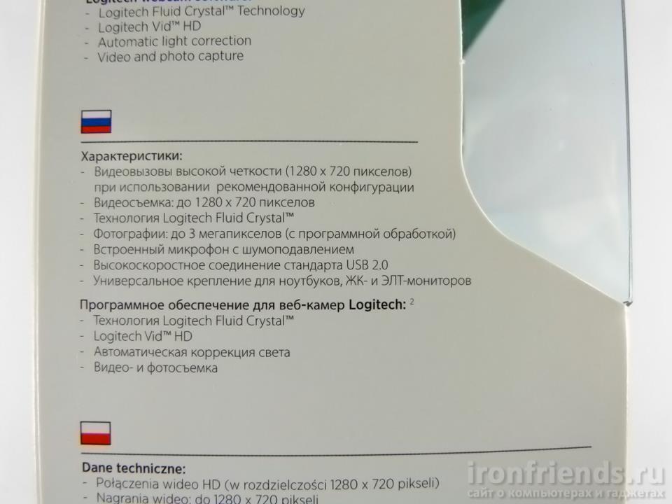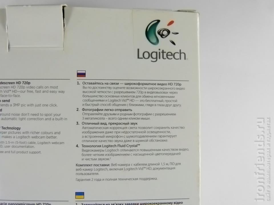 З інформацією на звороті коробки можна дізнатися, що програма Logitech Vid HD призначена для відеодзвінків, дозволяє знімати і відправляти фото одним кліком миші. Довжина кабелю становить 1.5 м, в комплект поставки входить програмне забезпечення та документація. Гарантія та технічна підтримка 2 роки.