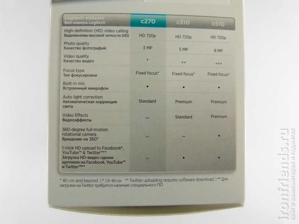 На іншій стороні коробки знаходиться порівняння Logitech C270 з іншими веб-камерами виробника. Звідси також можна дізнатися, що веб-камера має фіксований фокус.