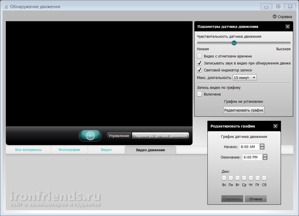 Тут можна налаштувати чутливість датчика руху, наприклад, щоб запис не починалася від пробежавшей повз кішки. Можна також включити або відключити запис звуку, світлового індикатора, задати максимальну тривалість запису і налаштувати графік роботи датчика руху.