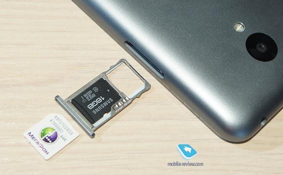 Побіжно переглянувши опис смартфона може здатися, що в ньому є підтримка карт пам’яті формату microSD, так і наявність двох слотів під SIM-карти. Насправді все менш райдужно — слот для карт пам’яті поєднаний зі слотом для другої SIM-карти. Тобто використовувати і те і те одночасно не вийде, або ви встановлюєте карту пам’яті, або другу «сімку».