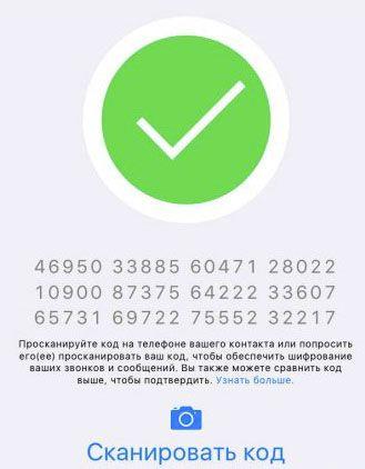- Перепишіть код з розділу інформації (він складається з шістдесяти цифр) та надіслати або іншим чином повідомте своєму співрозмовнику. Він в ручному режимі порівняти зі своїм таким же кодом на повідомленні. Зашифрованность передбачає збіг цих цифр. До речі, можна також натиснути «Поділитися» на екрані показу QR-коду і відправити в автоматичному режимі його співрозмовника.