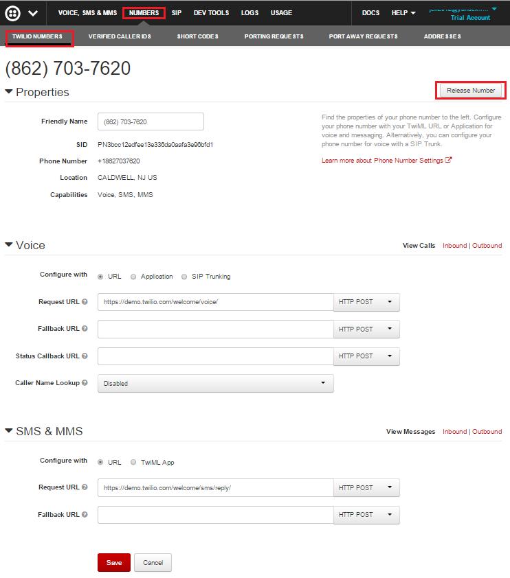 Якщо потрібно скинути налаштування, зайдіть в меню «Numbers» -> «Twilio Numbers» і натисніть «Release Number».