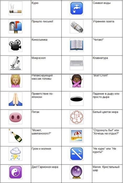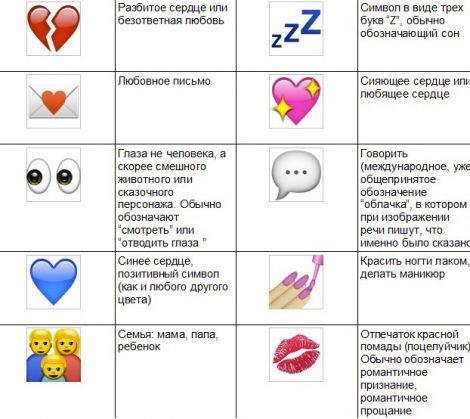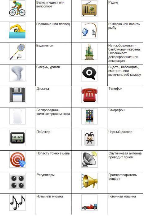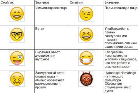 У таблиці наведено значення лише деяких забавних смайликів і звичайних смайлів, які використовують у Whatsapp (праворуч від кожного смайлика знаходиться його позначення):