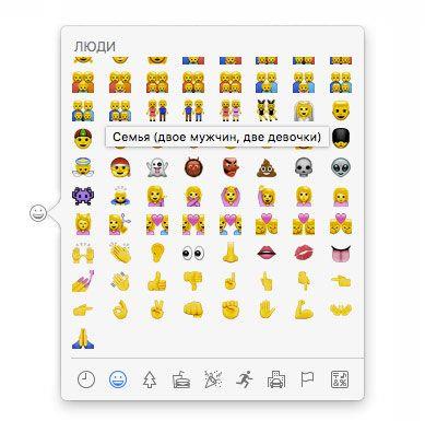 Для зручності всі позначення розділені на категорії, які показують приблизно, з якої області людських знань і відносин той чи інший смайлик: природа, люди, сім’я, прапори, жести, професії, предмети, фрукти, овочі, і взагалі їжа.