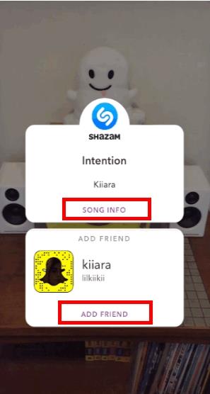 Щоб ідентифікувати пісню з Shazam, треба натиснути і утримувати екран камери. Якщо пісня розпізнана, з’явиться спливаюче вікно. Натиснувши «Song Info», можна побачити повноекранний огляд пісні. Натисканням і утримуванням відправка вмісту екрана одному — або провівши екран можна прослухати уривок з пісні, прочитати текст, подивитися відеокліп або ще що-небудь. Визначившись з аудіо-треком, можна натиснути і утримувати екран камери. З’являться нові піктограми, які дозволять користувачеві прикрасити знімок наклейками, написом, карлючками і т. д. Можна також провести пальцем вправо або вліво на екрані для Попереднього перегляду», потім додати до знімків кольорові фільтри, поточний час, місцеву погоду, накладення швидкості, геофильтры. Пісні, які були ідентифіковані, відображаються у налаштуваннях Snapchat. Щоб видалити пісню з історії Shazam, треба просто провести пальцем по екрану вліво і натиснути «Видалити».