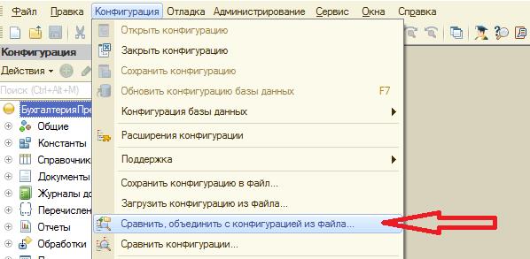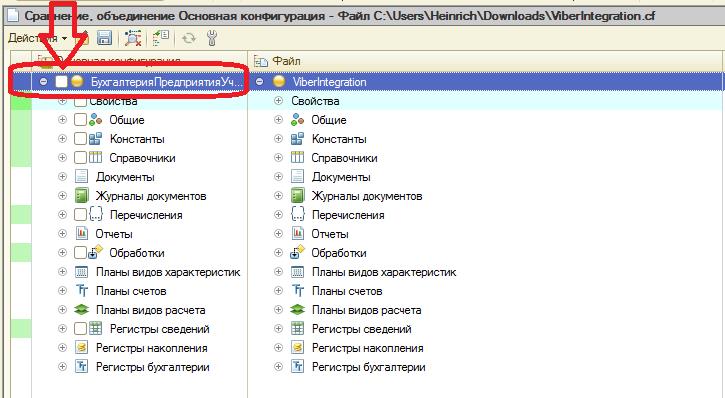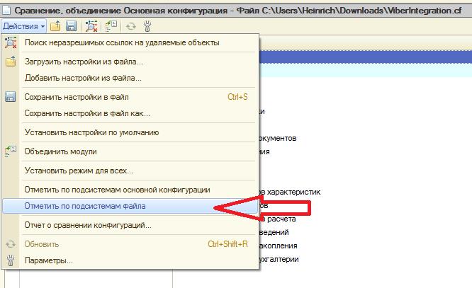 Встановлення виконувати від імені Адміністратора з повним пакетом прав. У режимі конфігуратора через меню Конфігурація — Порівняти об’єднати з конфігурацією з файлу вибрати файл ViberIntegration.cf (Рис. 7)