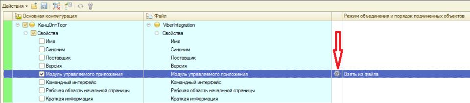 У режимі порівняння конфігурацій розкрити пункт Властивості і в Модулі додатку проставити галку, після чого зайти у вікно настройки об’єднання модулів (Рис. 11).