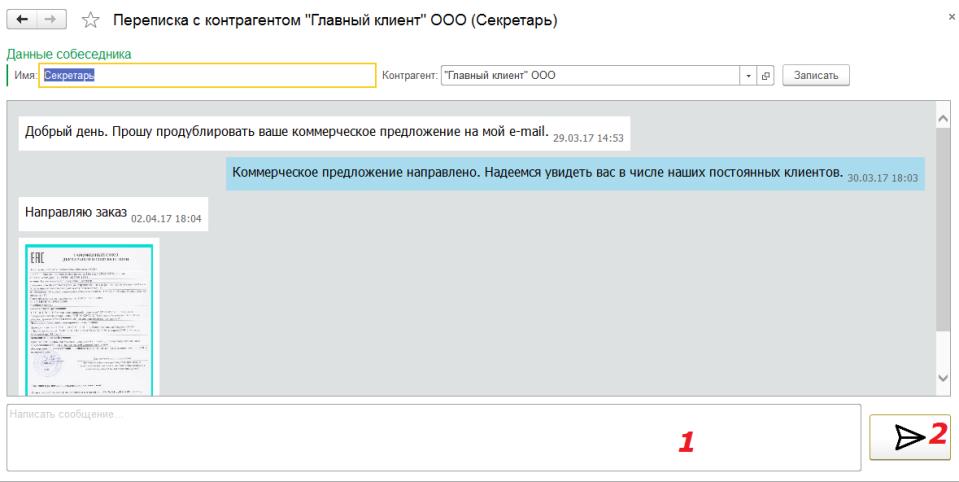 Вигляд вікна листування зміниться (див. рис.6): з’явиться вікно для вводу повідомлення (1) і кнопка для надсилання (2).