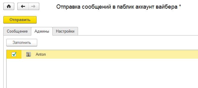 На закладці «Адміни» натиснемо «Заповнити». Після заповнення зазначимо прапором адміністратора, від імені якої буде відправлятися повідомлення. У даному випадку адміністратор один, виберемо його: