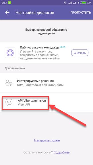 Після створення публічного облікового запису натисніть на розділ «API Viber для чатів».