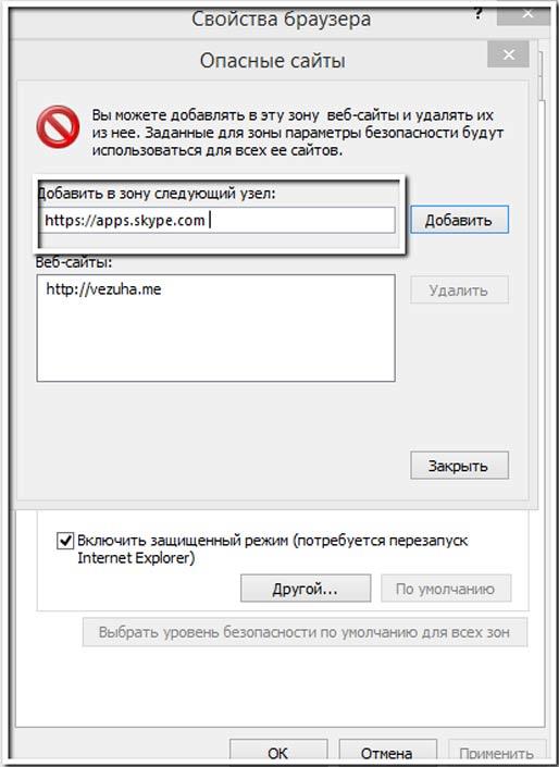 У вікні, дивіться скріншот, в адресний рядок пишемо адресу веб-сайту [https://apps.skype.com], тиснемо «Додати». Введену адресу додатися в нижнє поле, натискаємо «Закрити» => Ok! Не забудьте перезавантажити Skype, щоб зміни вступили в силу.