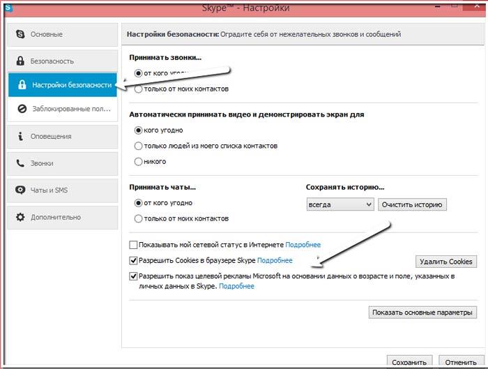 Ця реклама Skype забезпечується службою Microsoft Advertising і ретельно відібраними Skype. Вони використовують її для цільової реклами, на основі відомостей про ваших особистих даних, які ви вказали при реєстрації і збору даних на основі cookie-файли браузера та інформації про вашому відвідуванні веб-сайтів Skype. Для того щоб відключити цю рекламу Microsoft не поспішайте покинути розділ «Налаштування», а потім перейдіть в розділ «Безпека». Відкрийте блок «Додаткові налаштування і зніміть галочку» навпроти рядка «Дозволити показ цільової реклами на підставі даних віку і статі». Не забуваємо зберегти зміни.
