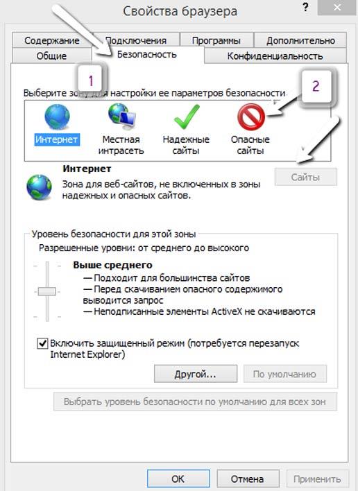 Відкриваємо програму Internet Explorer, який входить в комплект операційної системи Windows. Заходимо в налаштування (шестірня) браузера в правому верхньому куті => Властивості браузера. Бачимо розділ «Безпека» і натискаємо на нього, далі переходимо у вікно «Небезпечні сайти» і тиснемо на «Сайти».