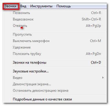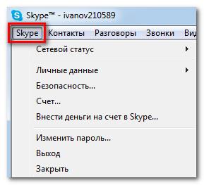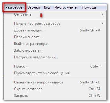 У цьому меню зібрані команди, пов’язані з розмовами в Скайп, іншими словами миттєвими повідомленнями. Діапазон опцій широкий: від перегляду старих повідомлень до налаштування повідомлень, які залежать від змісту повідомлення.
