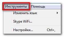 Відкрийте меню Інструменти для доступу до онлайн ігор, налаштувань облікового запису Скайп. Найчастіше ви будете користуватися пунктом Параметри для налаштування звуку, безпеки і т. д.
