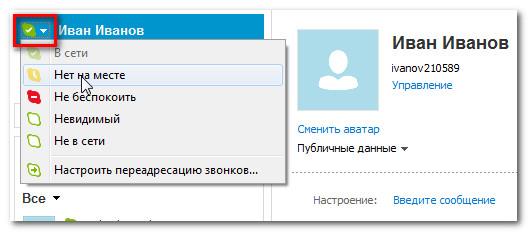 У меню Skype ви можете змінювати інформацію свого облікового запису, наприклад, онлайн статус, щоб показати, що ви доступні для розмови. Також тут ви можете вийти з Skype.