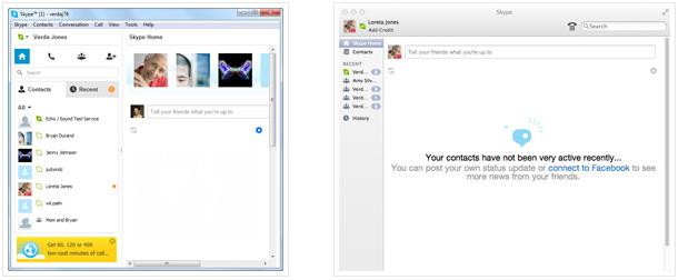 Вкладка Домашня сторінка Skype дозволяє перейти до домашньої сторінки Skype. Це перше, що ви бачите при вході в Skype, вона ж представлена на малюнку з інтерактивними кнопками. Тут ви можете подивитися статус оновлень; новини та швидко перейти до контактів, з якими ви спілкуєтеся найчастіше.